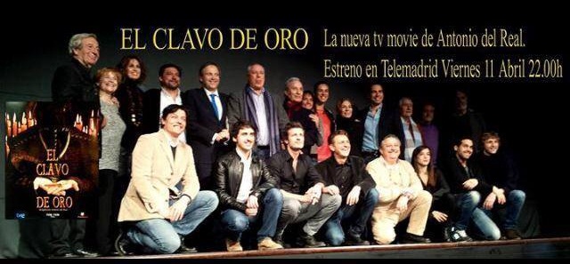 La Sala Berlanga acogió el pasado 24 de Marzo la proyección de la “TV Movie” El Clavo de Oro, dirigida por Antonio del Real. Producida por Paso a Paso Films, TVE y Telemadrid, está interpretada por Juanjo Artero, Jesús Olmedo, Emilio Gutiérrez Caba, Blanca Jara, Marta Calvó, Junio Valverde, Cesáreo Estébanez, Alejandro Tous, Luis Varela, Manuel de Blas, Enrique Villén y Antonio Medina, entre otros. Al pase, exclusivo para medios de comunicación e invitados de la productora, asistieron los actores y equipo técnico.