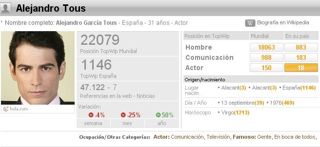 Cotilleando por Internet hemos descubierto que En Internet existe una lista donde ponen a la gente más popular de Internet, y Alejandro Tous aparece en ella... Al hacer la búsqueda con restricciones, poniendo Alicante y ficción, Alejandro sale en el puesto número 12: